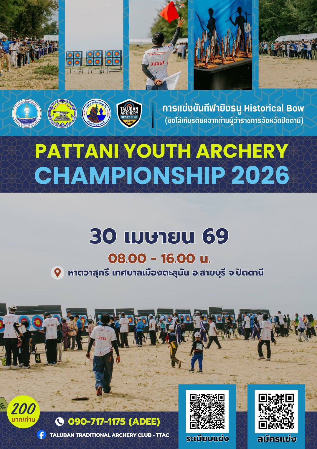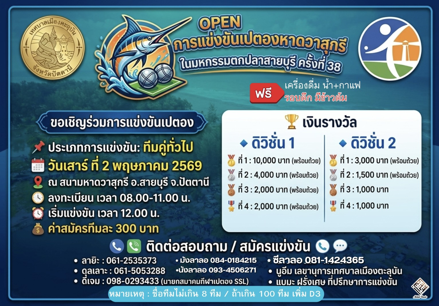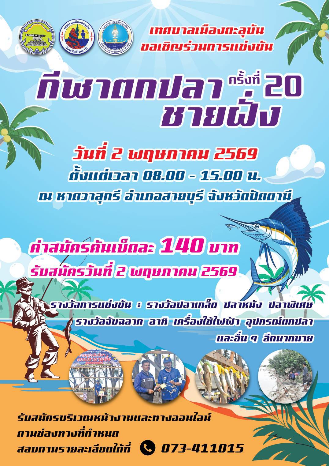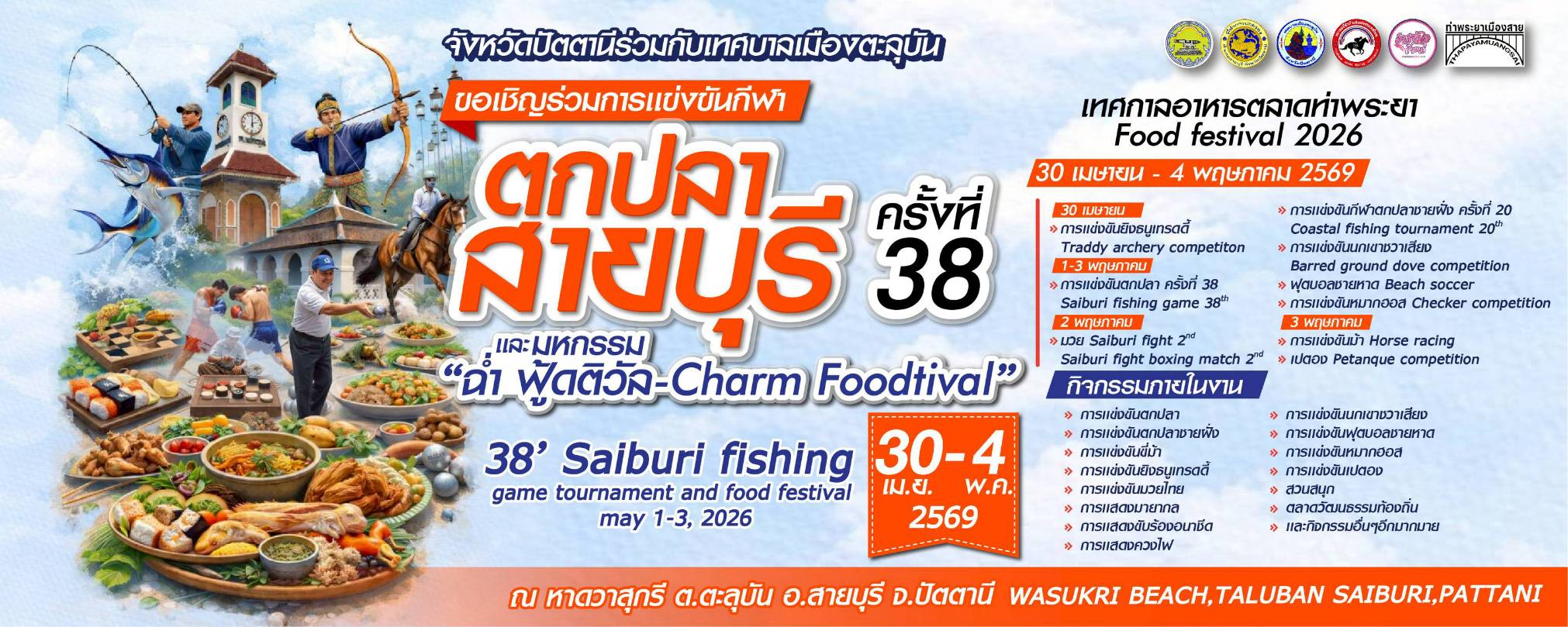 ขอเชิญชวนประชาชน นักท่องเที่ยว และนักตกปลาทั่วสารทิศ ร่วมเทศกาลยิ่งใหญ่ประจำปี การแข่งขันตกปลาสายบุรี ครั้งที่ 38 และเทศกาลอาหาร ประจำปี 2569 ระหว่างวันที่ 1 – 3 พฤษภาคม 2569 ณ หาดวาสุกรี ตำบลตะลุบัน อำเภอสายบุรี จังหวัดปัตตานี