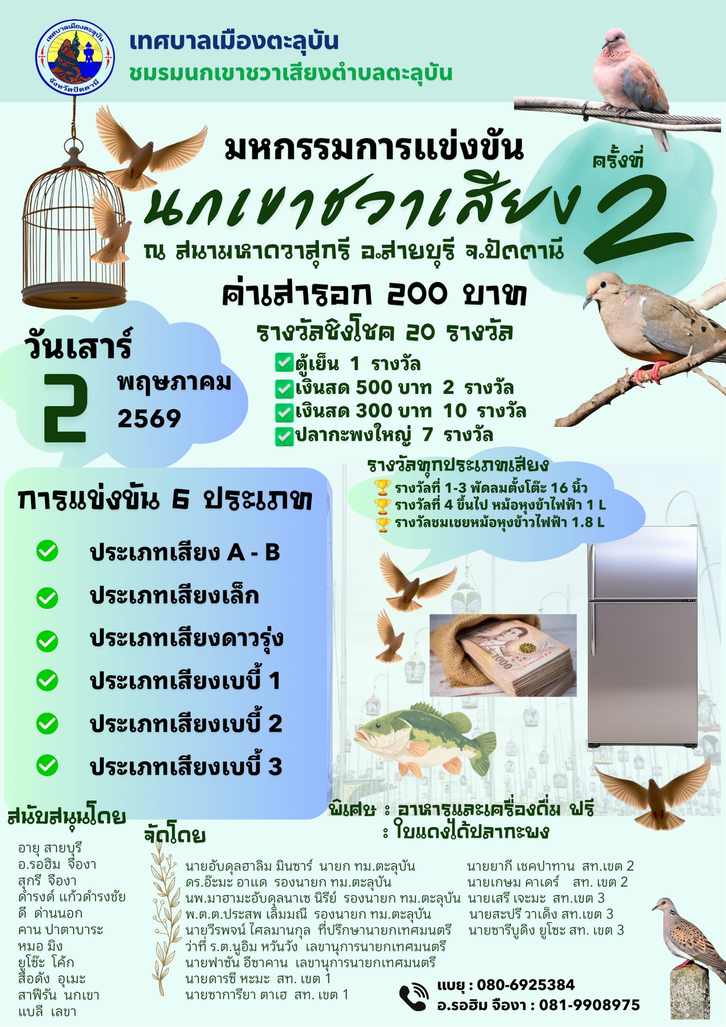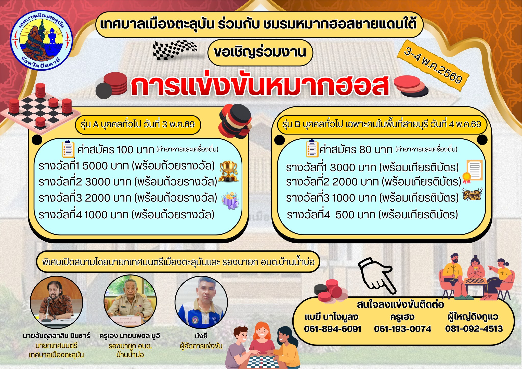 สอบถามเพิ่มเติมได้ที่ สำนักปลัดเทศบาล เทศบาลเมืองตะลุบัน โทร. 073-411015 |